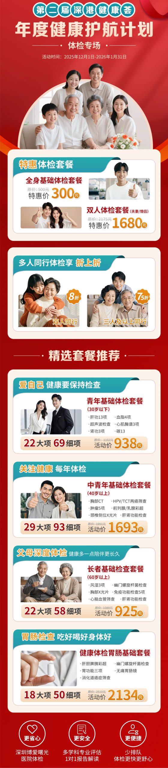 年度健康護航計劃 體檢專場 2025年12月1日-2026年1月31日 一份體檢,一份關愛。 這個冬天,讓我們用行動守 護您所愛之人的健康。 冬至陽生,歲末情暖。深圳博愛曙光醫院第二屆深港健康薈·年度健康護航計劃於2025年12月1日至2026年1月31日暖心開啟,通過一次全面的健康篩查,為家庭的幸福安穩保駕護航。 個性化套餐,滿足多元需求 為不同年齡段、不同健康狀況的人群量身定製了多款體檢套餐,涵蓋基礎篩查、專項檢查、深度體檢等多個維度,力求為每一位市民提供適合的、有價值的健康管理方案。 貼心服務,提升體檢體驗 少排隊,更省時:優化檢前預約流程,減少等候時間多學科評估:檢後提供專業報告解讀與健康建議溫馨環境:營造輕鬆舒適的體檢氛圍。精選套餐推薦 根據您的年齡、健康狀況和需求,我們準備了以下幾類套餐供選擇: 青年基礎體檢套餐(30歲以下) 包含肝功13項、血脂4項、超聲波檢查、心肌酶譜3項等22大項69細項檢查,關注年輕人常見的亞健康問題。 中青年基礎體檢套餐(40歲以上) 包含胸部CT、HPV/TCT兩癌篩查、腫瘤5項、前列腺/乳腺彩超等29大項93細項檢查,適合關注慢性病風險的中青年人群。 長者基礎檢查套餐(60歲以上) 包含風濕3項、幽門螺旋桿菌檢查、胸部X光片、心腦血管篩查等專項檢查,助力長者安享健康晚年。 胃腸基礎套餐 包含肝膽脾胰彩超、幽門螺旋桿菌檢查、舒適胃腸鏡等18大項50細項檢查,關注消化道健康。 溫馨提示: 健康是送給家人的好禮物。 在這個溫暖的冬季,帶父母做一次全面體檢,為愛人安排一次健康篩查,用行動表達關愛。 建議提前預約,錯峰體檢, 享受更舒適的服務體驗。